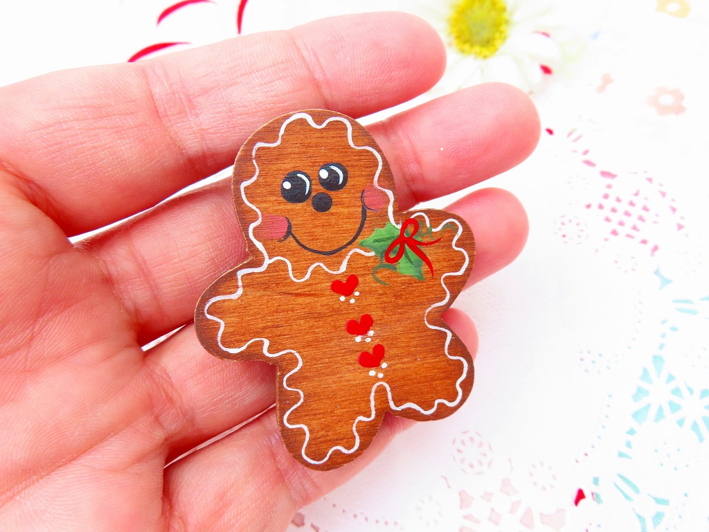 とても上手にペイントされた木製ジンジャーブレッドマンブローチです。
