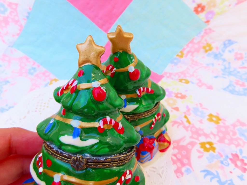 小さなクリスマスツリーの陶器製トリンケットボックスです。
