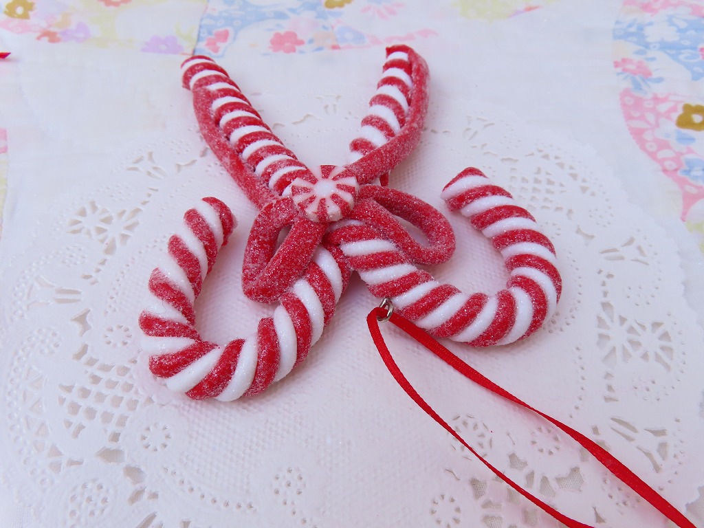 クロスしたキャンディケーンに大きなリボンが付いたオーナメントです。