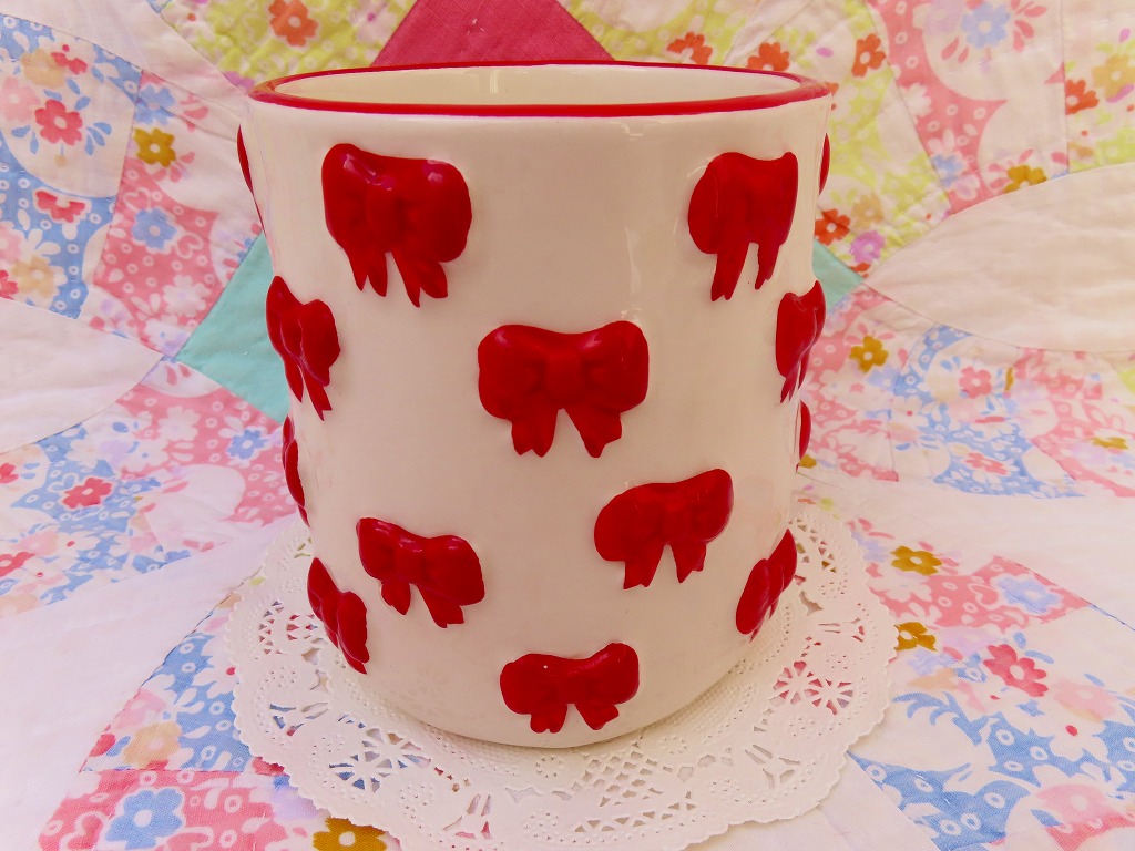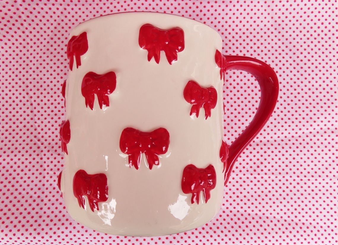 真っ赤なリボンがエンボスとペイントされたビッグサイズマグです。