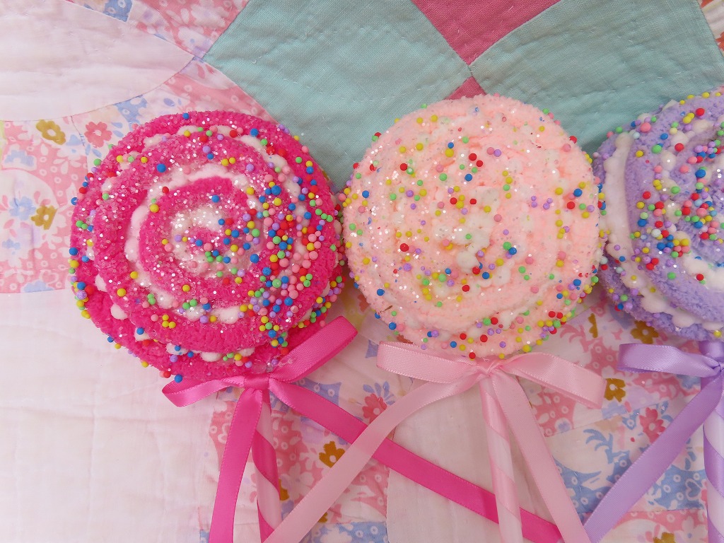 スチロールにもこもこの生地とスプリンクルとラメでデコレーションされています。